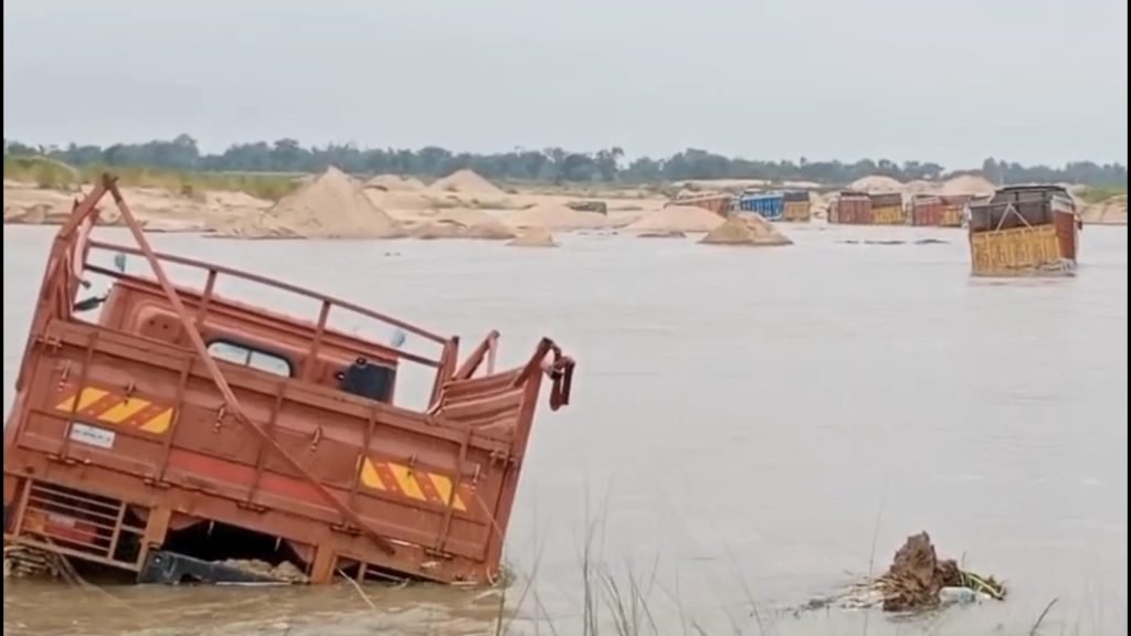 গলসি, পূর্ব বর্ধমান— তিন দিন ধরে লাগাতার বৃষ্টিপাতের ফলে দুর্গাপুর ব্যারেজ থেকে জল ছাড়ায় দামোদর নদের জলস্তর বিপজ্জনকভাবে বেড়ে গেছে। এই পরিস্থিতিতেও নদীর চর থেকে বালি তোলার কাজ অব্যাহত রাখার কারণে পূর্ব বর্ধমানের গলসি গোহগ্রামের সোন্দা বালিঘাট এলাকায় প্রায় ১৫টি ট্রাক মাঝ দামোদরে ডুবে গেছে।