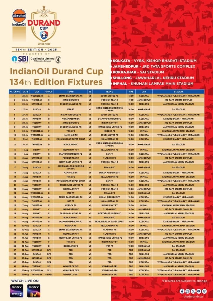 নিউজ ফ্রন্টঃ ঘোষিত হয়ে গেল ডুরান্ড কাপের ক্রীড়াসূচি। ২৩ তারিখ প্রথম ম্যাচে যুবভারতীতে খেলবে ইস্টবেঙ্গল বনাম সাউথ ইউনাইটেড এফসি। একই গ্রুপে মোহনবাগান, মহামেডান ও ডায়মন্ড হারবার এফসি।রাষ্ট্রপতি ভবনে ১৩৪ তম ডুরান্ড কাপের উদ্বোধন হল।