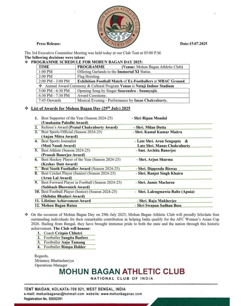 মোহনবাগান দিবস মানেই শুধু স্মৃতি নয়, সম্মান আর গর্বের মুহূর্তও। সব পুরস্কার প্রাপকদের জানাই আন্তরিক শুভেচ্ছা। 💚❤️