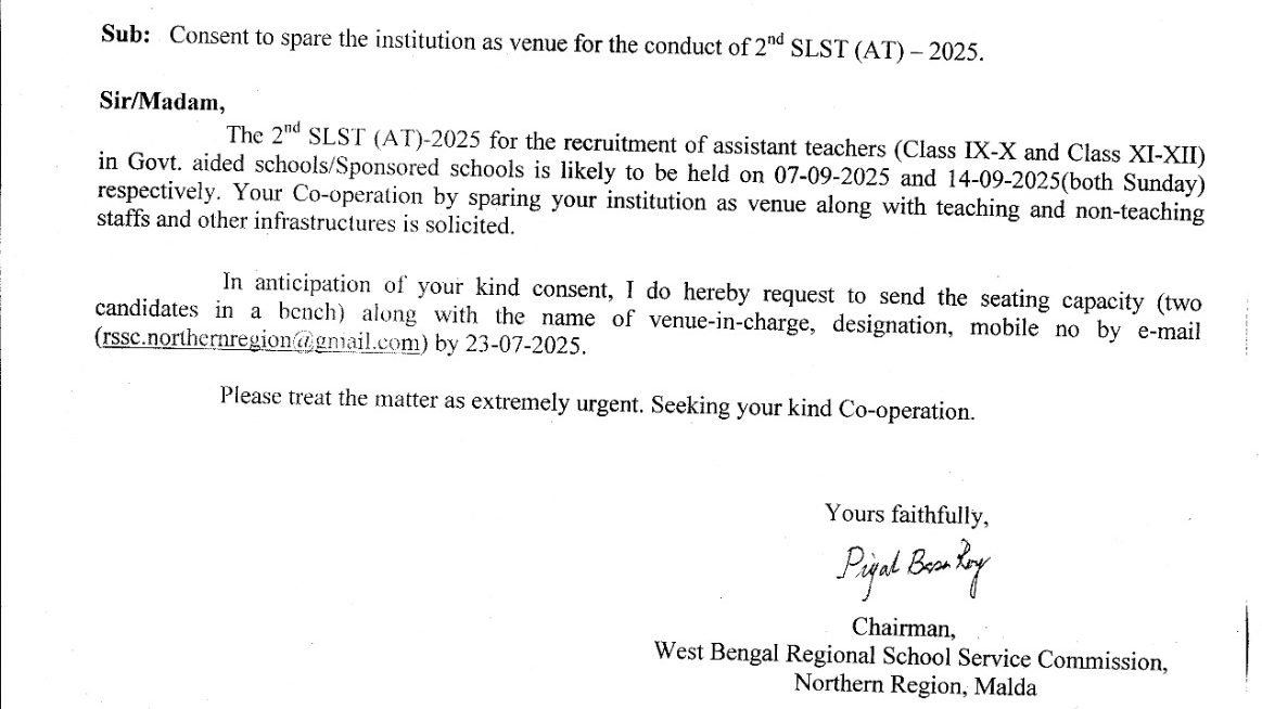 শিক্ষক নিয়োগের অপেক্ষায় থাকা প্রার্থীদের জন্য সুখবর! দীর্ঘ প্রতীক্ষার পর অবশেষে পুজোর আগেই স্কুল সার্ভিস কমিশন (SSC) লিখিত পরীক্ষা আয়োজনের প্রস্তুতি শুরু করেছে। নির্ভরযোগ্য সূত্র থেকে প্রাপ্ত খবর অনুযায়ী, আগামী ৭ সেপ্টেম্বর এবং ১৪ সেপ্টেম্বর, এই দুটি তারিখে লিখিত পরীক্ষা অনুষ্ঠিত হতে পারে। এই পরীক্ষার জন্য প্রয়োজনীয় কেন্দ্র চূড়ান্ত করার প্রক্রিয়াও শুরু হয়ে গেছে এবং ইতিমধ্যেই বিভিন্ন স্কুল ও কলেজ কর্তৃপক্ষকে পরীক্ষা কেন্দ্র হিসেবে ব্যবহারের জন্য চিঠি পাঠানো হয়েছে। খুব তাড়াতাড়ি এই বিষয়ে একটি অফিসিয়াল নোটিস প্রকাশ করতে চলেছে SSC।